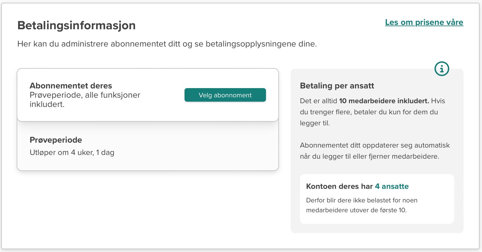 Når du har fylt inn alle nødvendige opplysninger, klikker du på «Start prøveperiode». Betalingen vil deretter automatisk bli trukket enten månedlig eller årlig – avhengig av hva du har valgt.