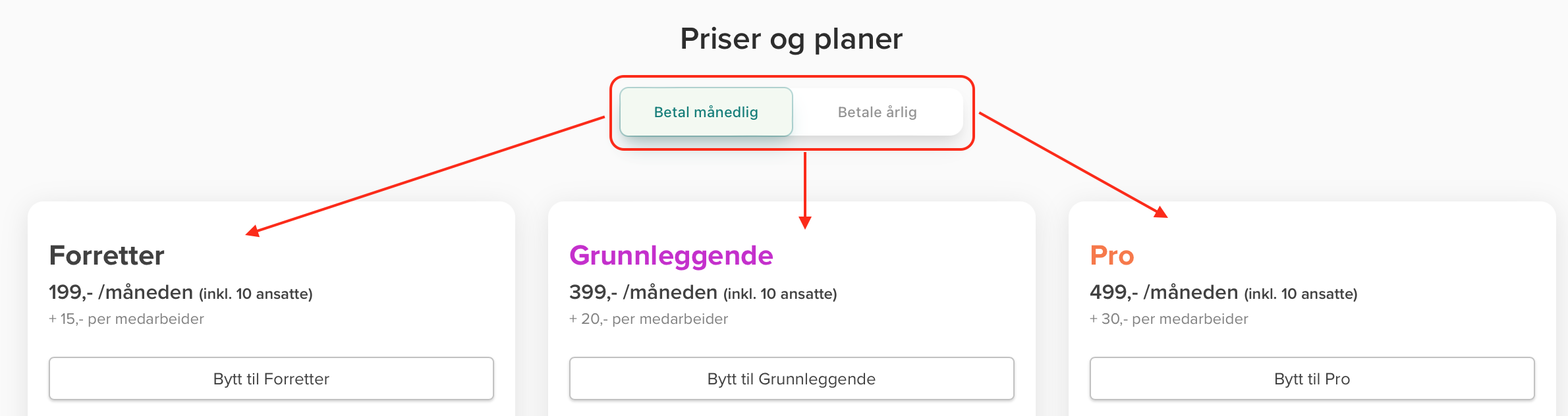 Her kan du endre eller velge abonnementet ditt. Klikk deretter bare på ønsket abonnement, og velg om du ønsker å betale månedlig eller årlig. Deretter blir du videresendt til betalingssiden, hvor du kan legge inn betalingsopplysningene dine.