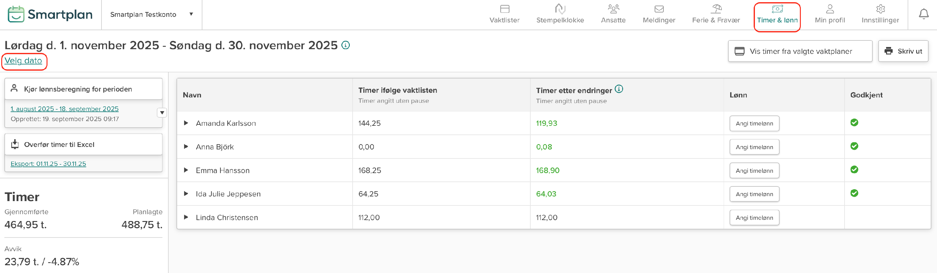 En oversikt over timer per ansatt for perioden vises.