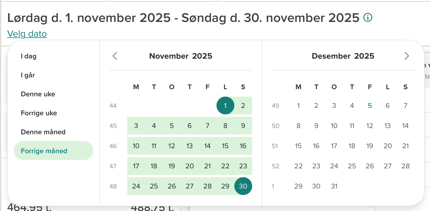 En datovelger åpnes. Her velger du perioden du ønsker å eksportere til Excel, for eksempel perioden 1. november - 30. november.