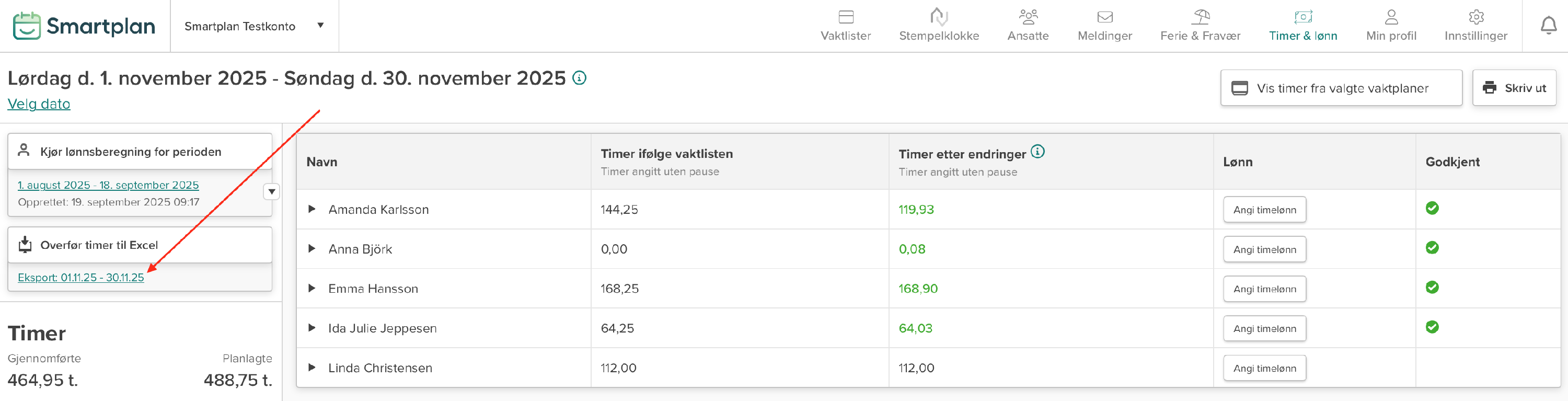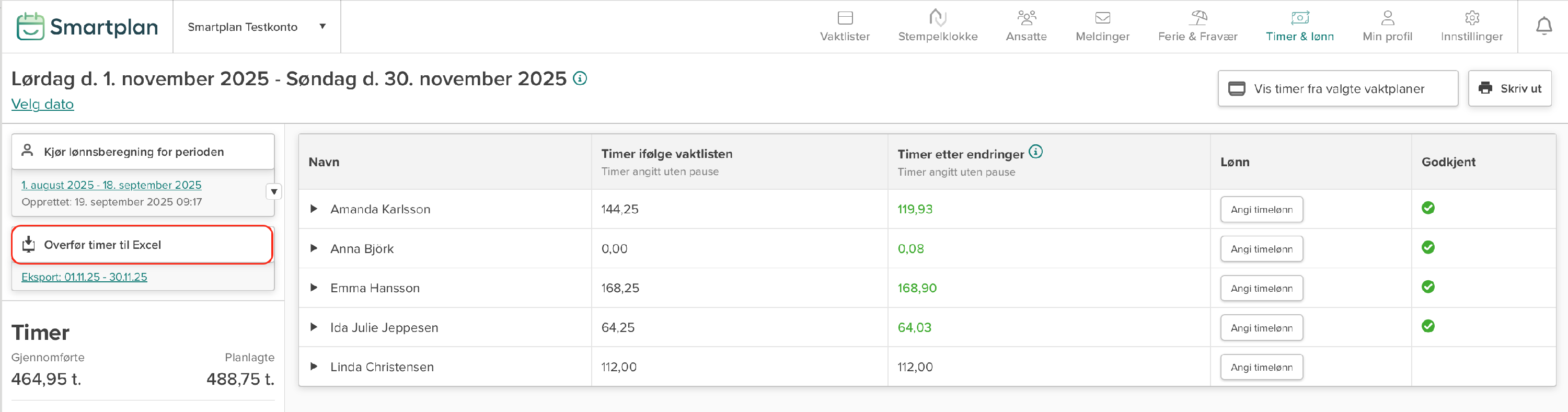 Her kan du også se om det er gjort endringer i de planlagte timene, og om disse endringene er godkjent (grønn) eller ikke (rød). Selv om endringene ikke er godkjent, vil de fortsatt vises i Excel-eksporten, så hvis endringene er feil, må de rettes først.