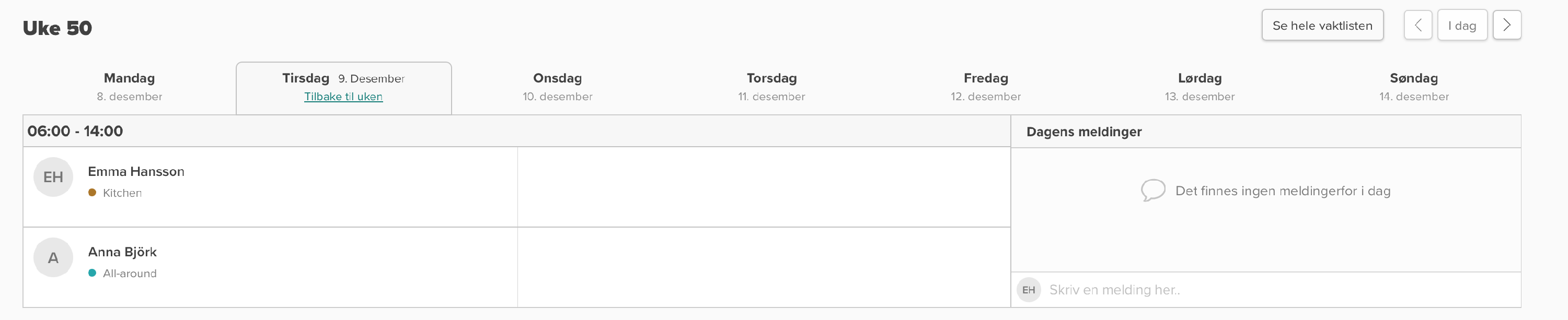 Når ansatte klikker på en dag i vaktlisten, åpnes dagen: