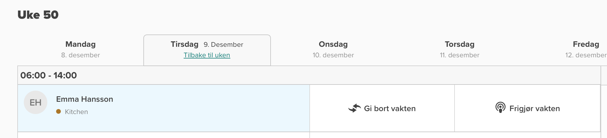 I noen tilfeller ønsker en ansatt bare å bli erstattet. De vil ikke spørre en spesifikk kollega. I disse tilfellene kan man bare trykke på Frigjør vakten i stedet. Deretter vil det fremgå av vaktlisten at man ønsker å legge ut vakten, slik at andre ansatte kan ta vakten.