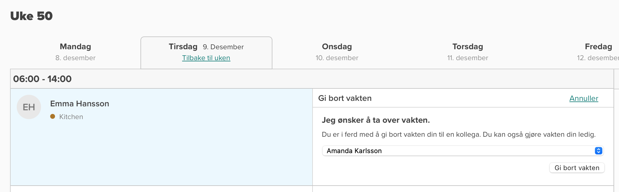 La oss si at jeg vil prøve å overføre min vakt til Amanda. Jeg trykker på Gi bort vakt: