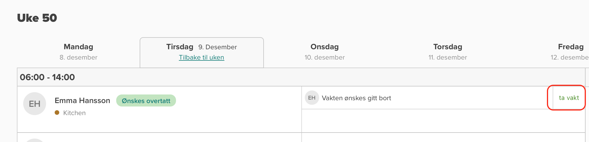 Når en kollega til Emma klikker på dagen, kan vedkommende gå inn og ta vakten: