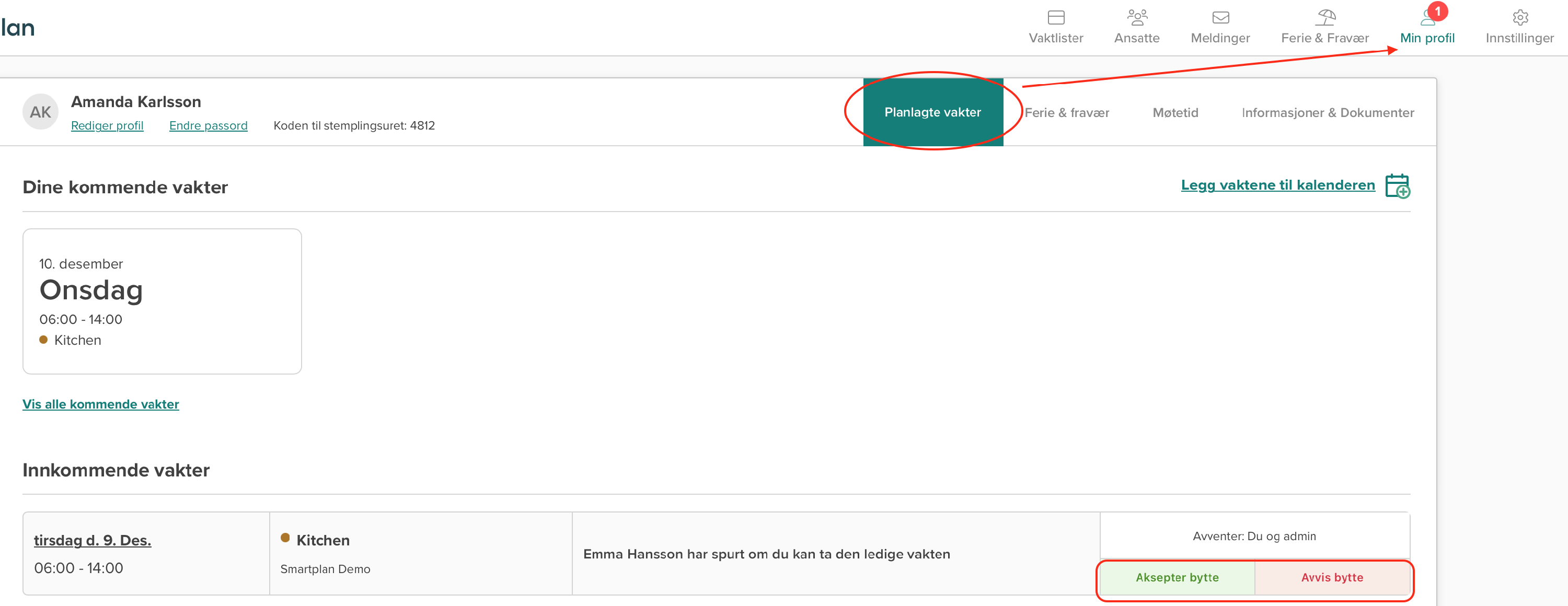 Hvis en kollega har ønsket å overføre sin vakt til deg, vil du kunne se det under "Min Profil":