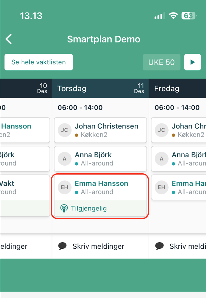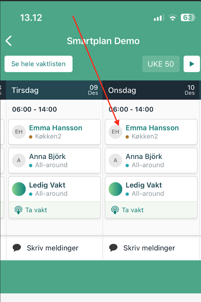 Deretter skal du klikke på den vakten du ønsker å overføre. I mitt eksempel er brukeren min Emma. Jeg vil gjerne overføre min vakt onsdag 10. december, så jeg klikker på den: