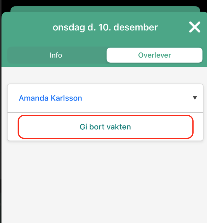 Deretter klikker jeg på "Overlever" øverst til høyre. Klikk på den lille pilen for å velge hvilken ansatt du ønsker å overlate vakten til, og klikk deretter på "Gi bort vakten":