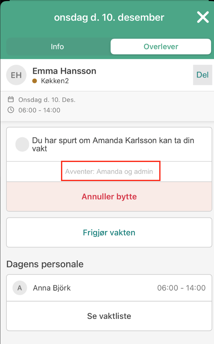 Nå vil det på vakten stå at du ønsker å overføre den. Her kan du også se hvem som mangler å godkjenne vaktbyttet. I mitt eksempel mangler Amanda og en administrator å godkjenne vaktbyttet: