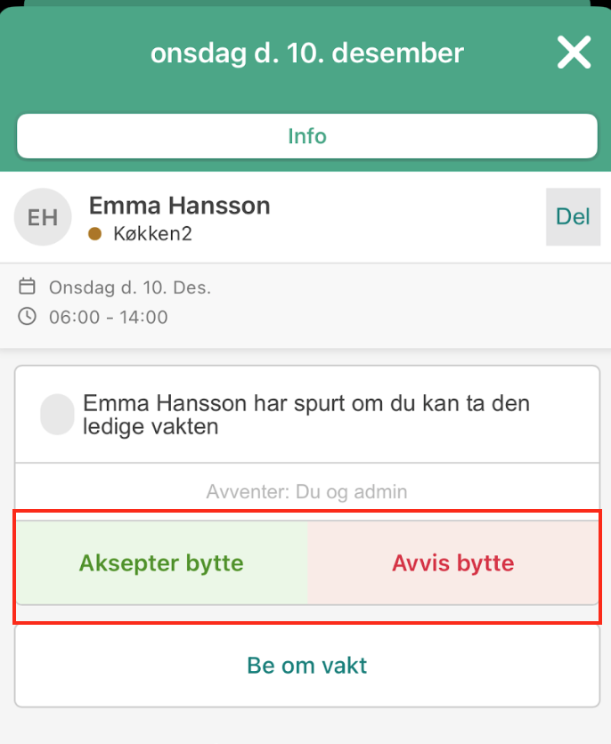 I eksemplet under er brukeren min Amanda, og som du kan se, har jeg mottatt en forespørsel fra Emma om at jeg skal overta kjøkkenvakten hennes fra kl. 06:00–14:00 den 10. desember: