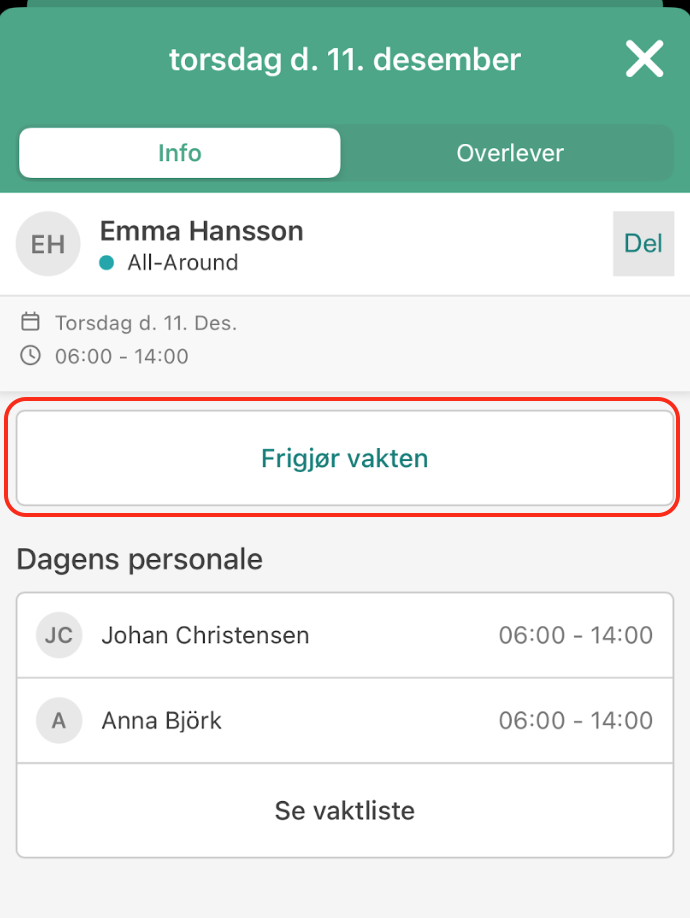 Når du har trykket på "Frigjør vakten", vil alle ansatte kunne se i vaktlisten at du ønsker å legge den ut: