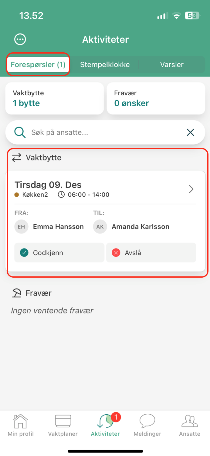 Du vil se en notifikasjon på menypunktet "Aktiviteter" i appen. Klikk på "Forespørsler". Det vil nå være mulig å se hvilken vaktbytteforespørsel som venter, og enten godkjenne eller avslå den: