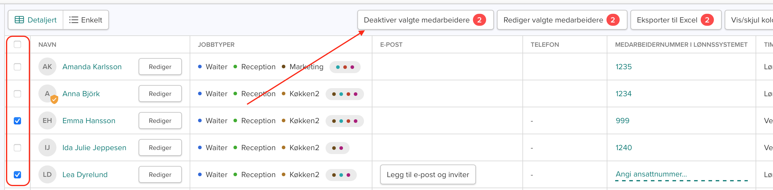 Åpne først medarbeideroversikten og velg de personene du vil deaktivere. Du kan markere enkelte ansatte eller flere samtidig, og deretter klikke på "Deaktiver valgte medarbeidere".
