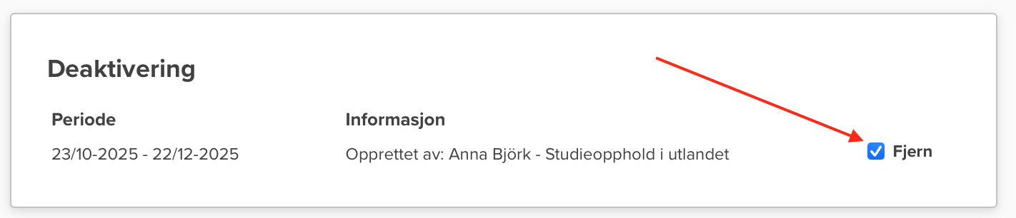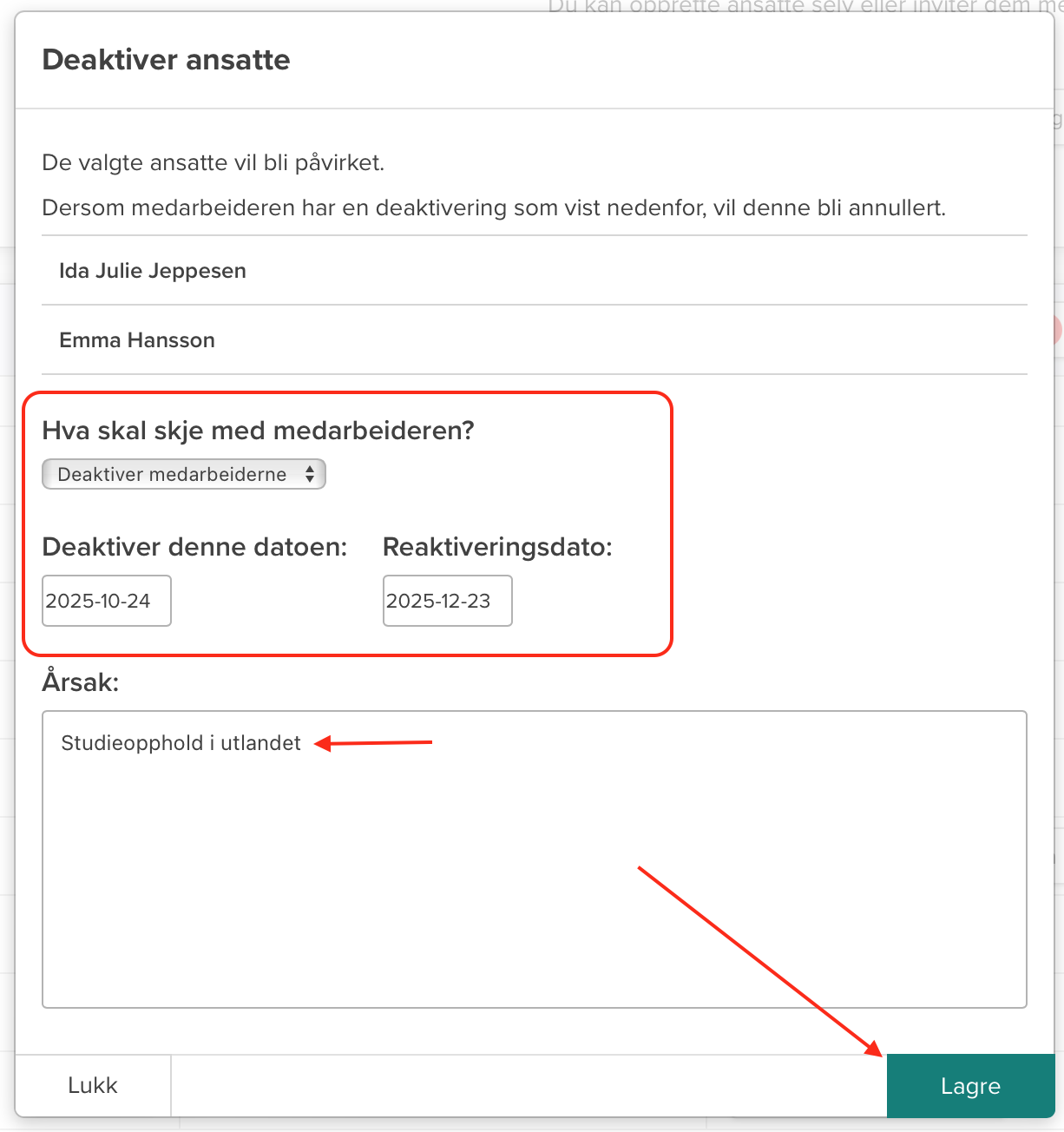 For å bekrefte deaktiveringen må du angi årsaken (for eksempel “studieopphold i utlandet”) og klikke på Lagre. Når dette er gjort, vises deaktiveringsstatusen og den valgte perioden direkte i medarbeideroversikten. På den måten kan du alltid se hvilke ansatte som for øyeblikket er satt på pause, og når deaktiveringen deres avsluttes.