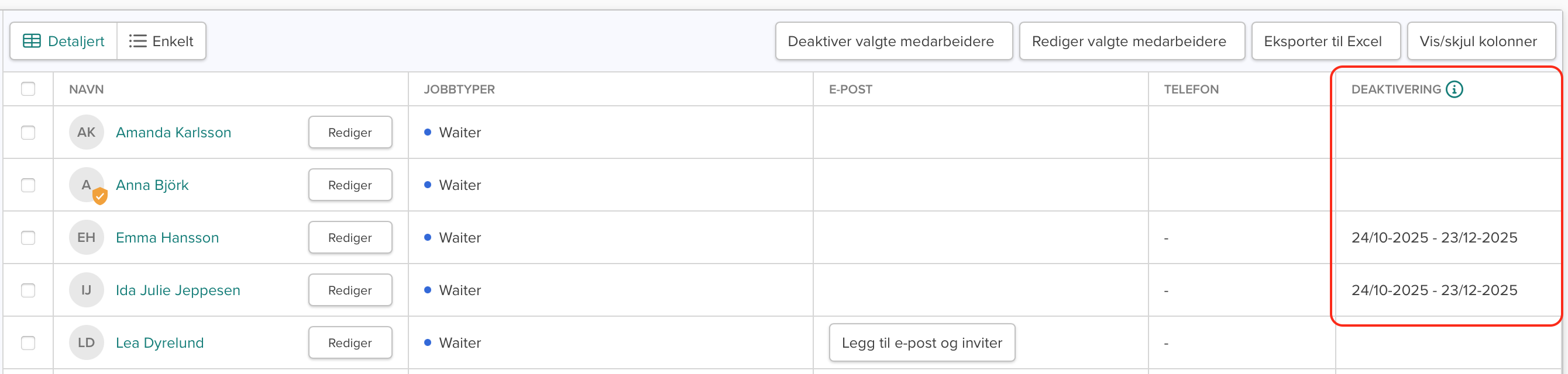Ansatte blir automatisk aktivert igjen når den valgte perioden er utløpt.